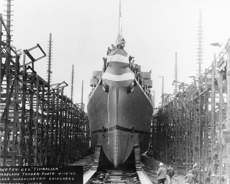 Timbalier (AVP-54) launching, 18 April 1943, at Lake Washington Shipyards, Houghton, WA (US Navy Photo).