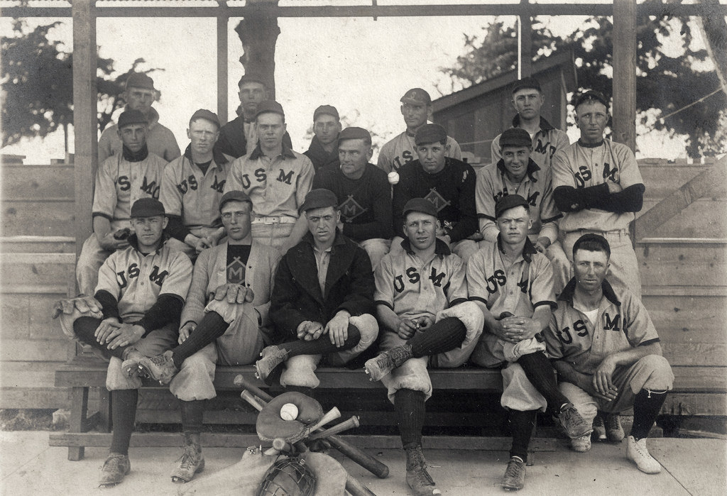 Caption tape on the reverse reads: “The base ball squad, Marine Barracks, Navy Yard, Mare Island, California. 1916”