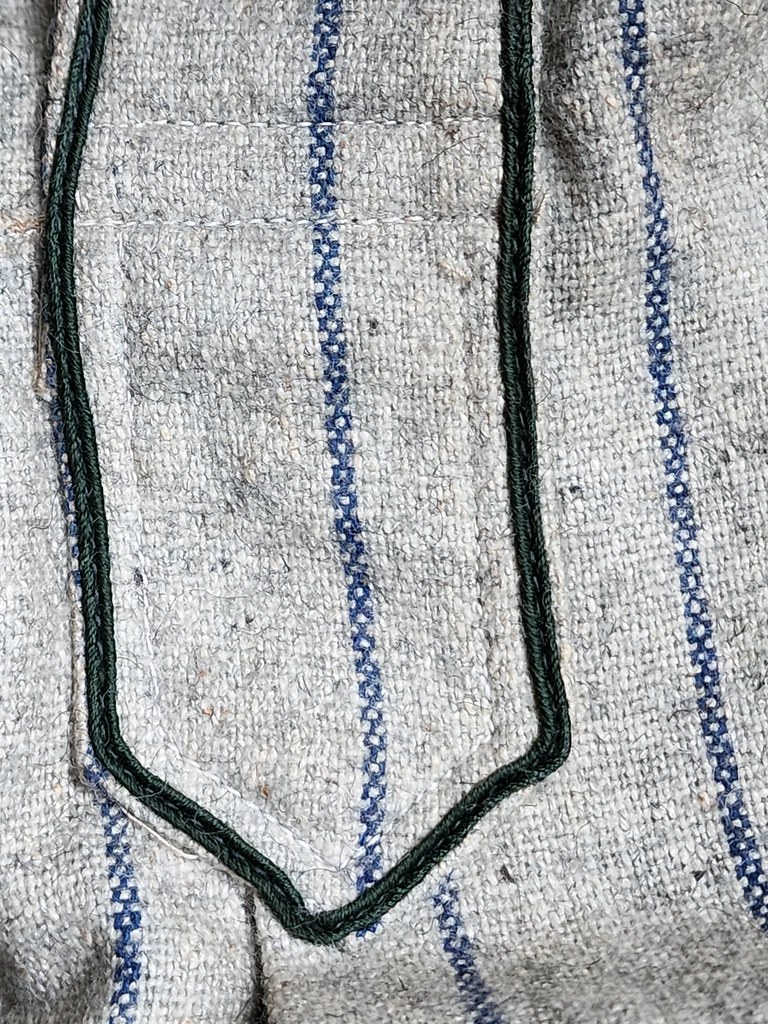 - Soutache: 1/4″ single line extending down the outer seams of the trousers to the bottom hem of the legs.