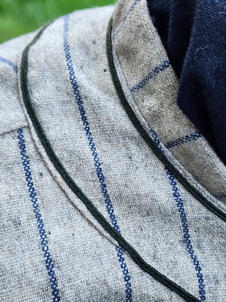 - Soutache: 1/4″ single line on each side of the placket, extending down to a point following the stitching and extending upwards, encircling the collar with two strands.