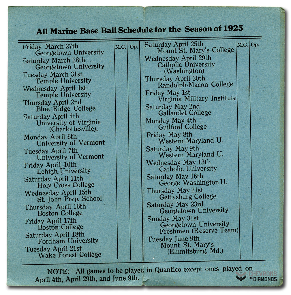 The Marine Corps Barracks at Quantico served as a training facility for officers and provided technical training for enlisted personnel. The installation fielded a ball team, comprised of both officers and enlisted that by the mid-1920s was competing in a collegiate league on the eastern seaboard.