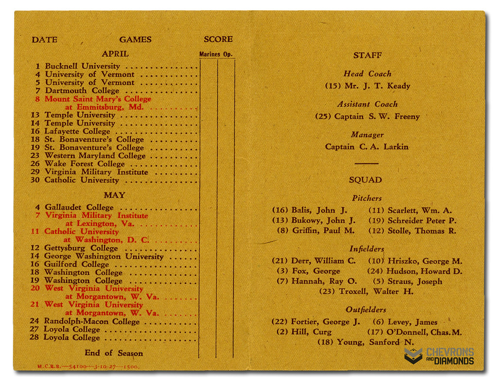 “The Marines , under the tutelage of Coach Keady, have ended their most successful season since the Marine have been playing college baseball, having piled up eighteen wins and were stopped only twice this year, ” the Washington Post published on May 29, 1927. “Two North Carolina colleges turned them back, Wake Forest winning, 3 to 1, and Guilford College nosed them out in a heavy artillery duel, 11 to 10. Among the leading teams defeated by the Marines are Washington and Lee, Dartmouth, Lafayette, West Virginia twice, and Waseda University of Japan, who had to accept a 9 to 6 setback at Quantico Thursday, 26th,” the article, Marines Beat Loyola, 5-2, in Closing Game, stated.