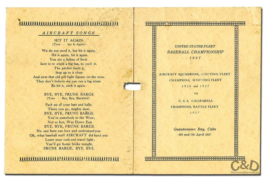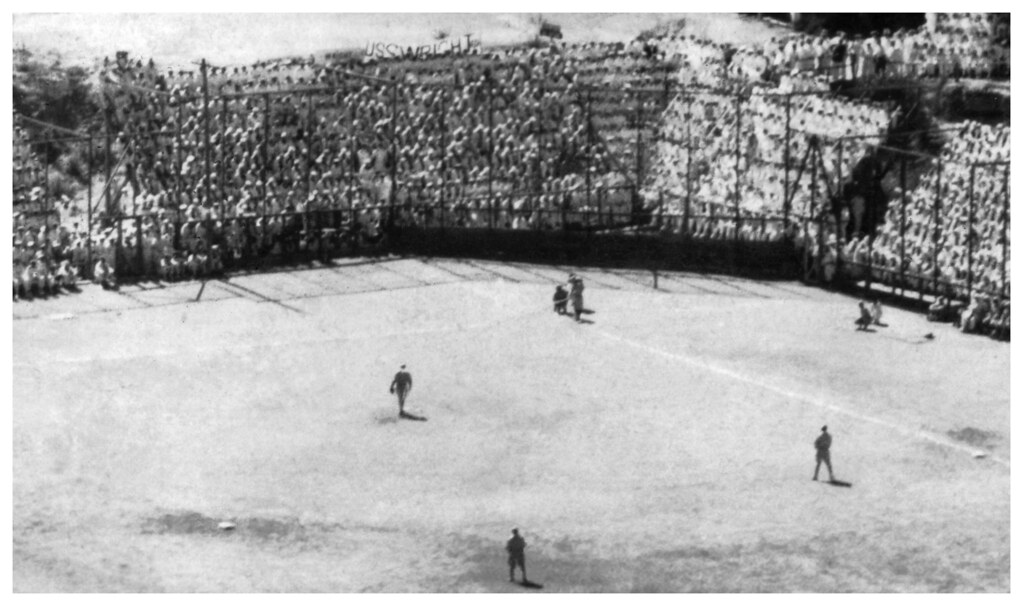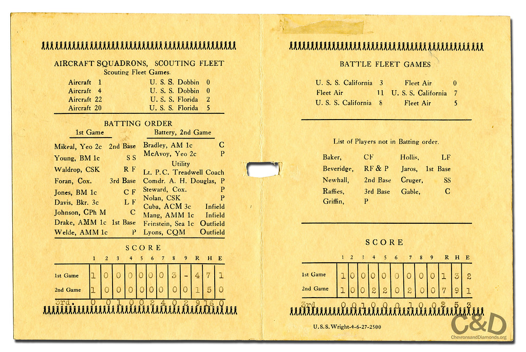 Serving as a seaplane tender in 1927, the USS Wright (AV-1) fielded baseball teams that throughout the 1920s and ’30s were vying for or winning fleet championships. In 1930 and 31, the Wright secured consecutive overall fleet titles. In 1927, the club from the battleship USS California (BB-44), captured the Battle Fleet Championship and the only club standing in their way for the Fleet title was the USS Wright club.