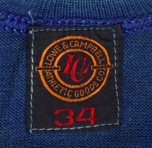This 1930s basketball uniform tag has a black background with the circular element and the wordmarks embroidered in gold. The lettering of the center logo is in red along with the garments size image source: 100percentauthentic).