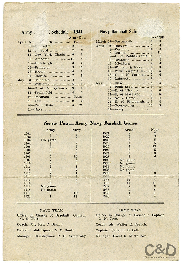 Aside from the ancillary ink marks, it appears that the original scorecard owner was either unfamiliar with how to score a baseball game or he (or she) was solely tracking the Army’s runs (Chevrons and Diamonds Collection).