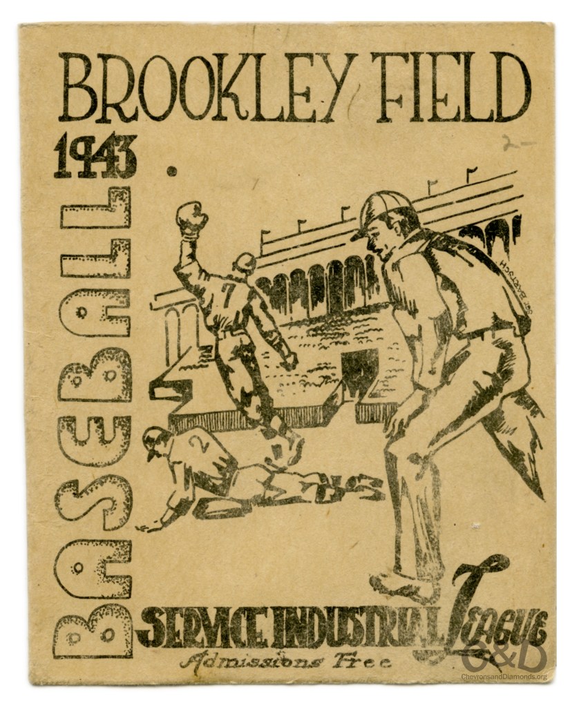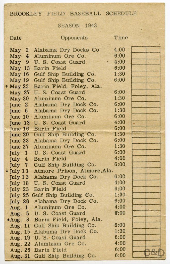 This monochrome-black piece is printed on heavy cardstock and folded to form a four-page schedule and roster for the Brookley Field Army Air Forces baseball team that played in the Service Industrial League in the Mobile, Alabama region. Facing service teams including the U.S. Coast Guard and the Naval Outlying Landing Field, Barin, Brookley Field also saw action against civilian clubs including Alabama Dry Docks Company, Aluminum Ore Company, Gulf Shipbuilding Company and Altimore Prison.