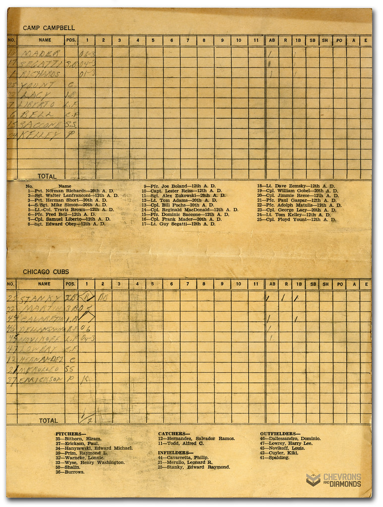 Camp Campbell’s manager, Jimmie Reese, playing in his last game for the Army, pinch-hit in the ninth inning grounding weakly to relief pitcher, Lon Warneke. Forty-two-year-old Reese was honorably discharged the next day, July 14, 1943.