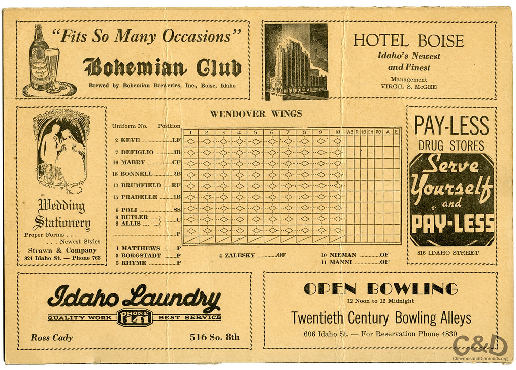 A departure from other scorecards in the Chevrons and Diamonds Collection, the two Army Air Forces ball clubs featured on this game scorecard lack the star-power seen on other service team rosters. Regardless, the Gowen Field club’s success led them to the National Semi-Professional Championship tournament in Wichita, Kansas.