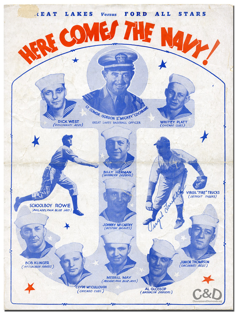 Two days after trouncing Flint’s Recreation All-Stars and carrying a 33-game win-streak into Dearborn, Michigan’s Rotunda Field to face the Ford All-Stars. While Lt. Cmdr. Gordon “Mickey” Cochrane‘s Navy squad featured a mix of major and minor leaguers, the “Blue Oval” squad, led by Hall of Famer Walter “Rabbit” Maranville and coached by Wally Pipp, proved to be a formidable foe. Ford’s shortstop Gene Malish and pitcher Bert Fodor were the keys to ending the Great Lakes win streak with a 2-1 victory.