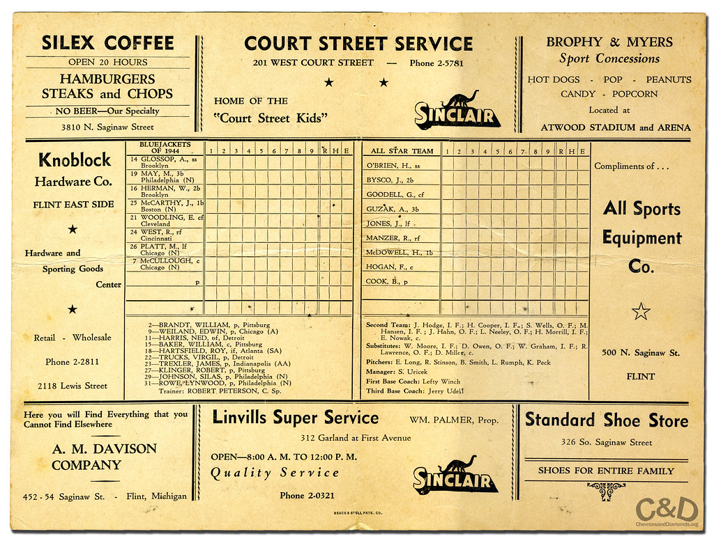 More than $5,500 was raised at Flint, Michigan’s Atwood Stadium on July 4, 1944 as they defeated the Recreation All-Stars by a score of 11-1. Virgil Trucks faced off against the All-Stars’ Silas Johnson. The Navy scored twice in the first inning and tallied five in the fifth, twice each in the eighth and ninth frames. View or print a full copy of this scorecard.