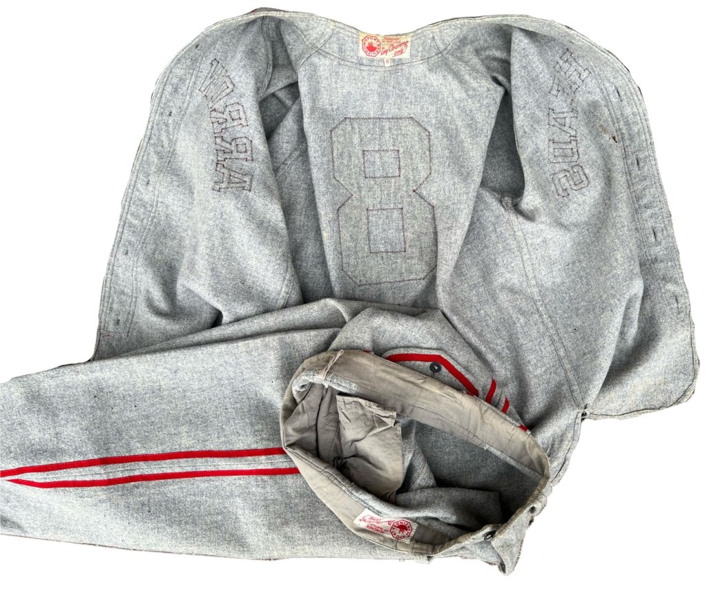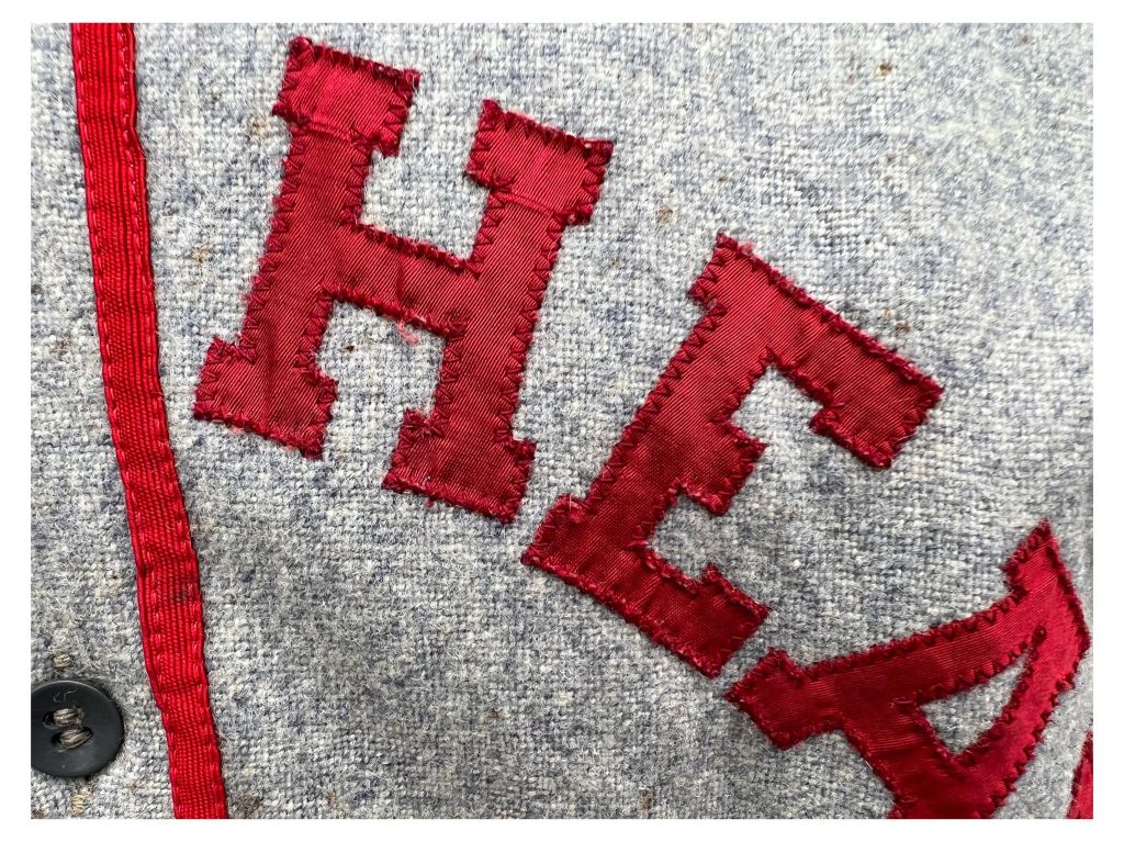 Specifics to the manufacturer give it an even more likely attribution to use by a “T-Patcher” (referring to the 36th Division’s unit insignia of a “T” superimposed over an arrowhead). The pants interestingly use a zipper fly, a trend that was not used in American baseball uniforms until the 1960s, and the zipper itself, however, is of mid-40s vintage from a German zipper company that made them during the war and in the immediate postwar period.