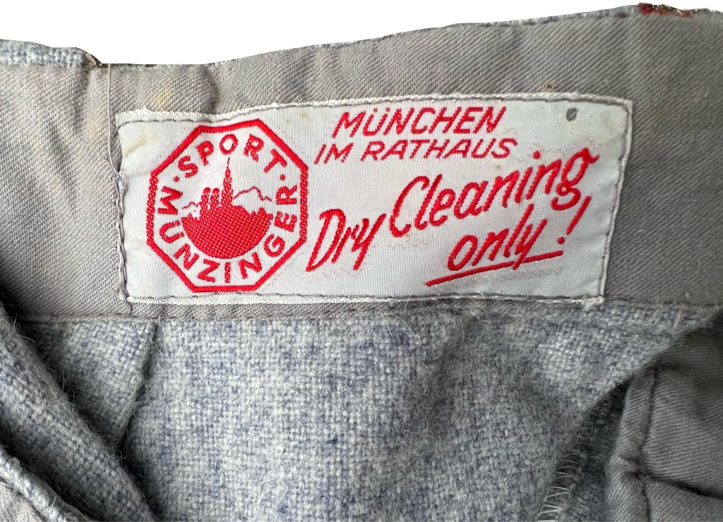The rest of the jersey and pants are marked with the tag of the primary manufacturer “Sport Munzinger, München Im Rathaus.” Besides being manufactured in Munich, close in proximity to the occupation area of the 36th Division in 1945, the company itself was a notable producer of sporting goods from 1908 until 2020! They were housed in the bottom floor of the Munich town hall, as is mentioned on the tag, and during occupation manufactured whatever they could to survive (so long as someone was willing to provide the material). The tag on this uniform matches several other 1940s examples from the company including some civilian sports clothing and even a Gebirgsjager winter smock the company made for the German army. Drury contacted the company which purchased Sport Munzinger in 2018 but has yet to hear back if contracts or documentation has been retained from 1945.