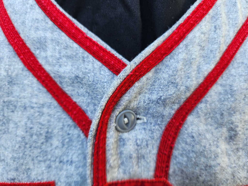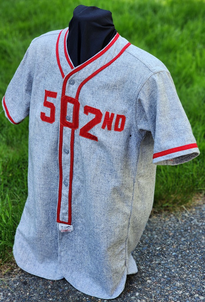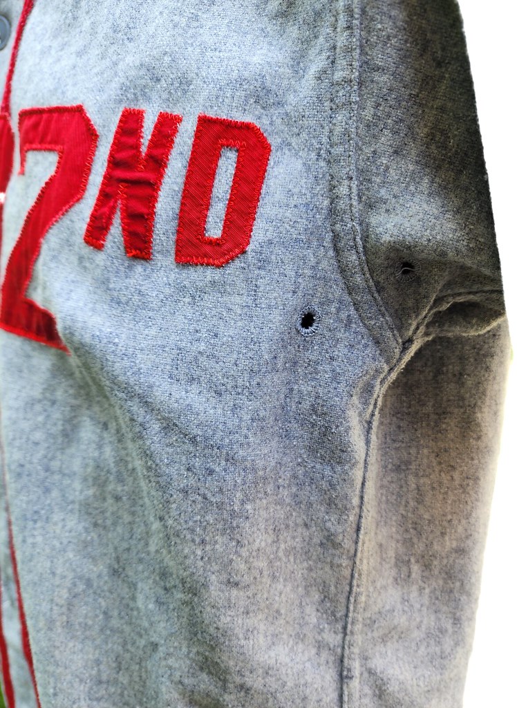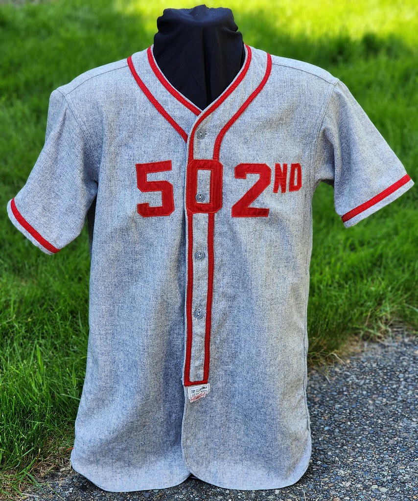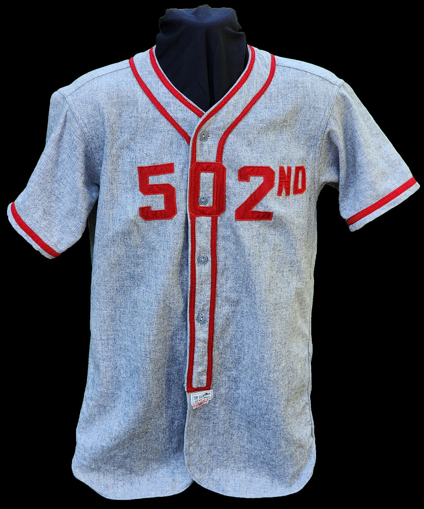 A wrench was thrown into the dating process when we examined the lettering on the chest and the back numerals. Rather than the typical athletic felt material, the 502nd features an unusual rayon-line fabric that is applied using a broad zigzag stitch. At a glance, one would assume that the jersey dated to the 1950s however, the lettering material is inconsistent with any era of baseball jerseys and the open zigzag stitching is unlike what became more common in the late 1950s and into the following decades. Turning to the 1945 German-made 36th Division “Arrowheads” flannel, we see the same material and stitching leading us to the conclusion that the 502nd employed local tailors to letter and number their baseball uniforms. The 36th Division uniform was made in Munich which is in proximity of Mittersill region making it likely that the 502nd flannel was lettered at the same German business.