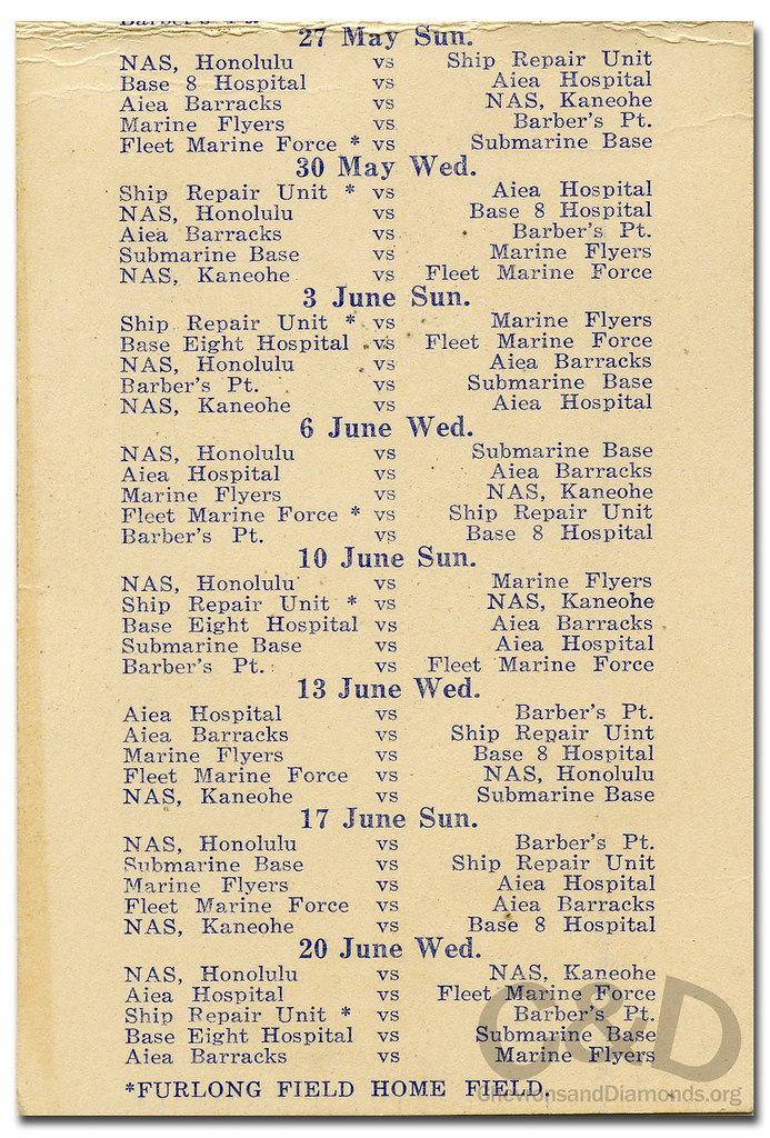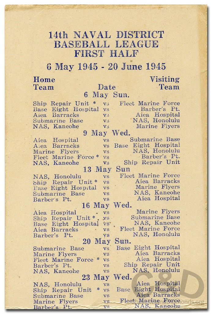 By the time that the 1945 14 Naval District season got underway in early May, the majority of the 1944 season’s stars were playing for the benefit of combat troops in the Western Pacific. Newcomers to Navy baseball in Hawaii included Billy Herman, Bob Lemon, Fred Hutchinson, Stan Musial, Ted Williams, Rollie Hemsley and Johnny Pesky.