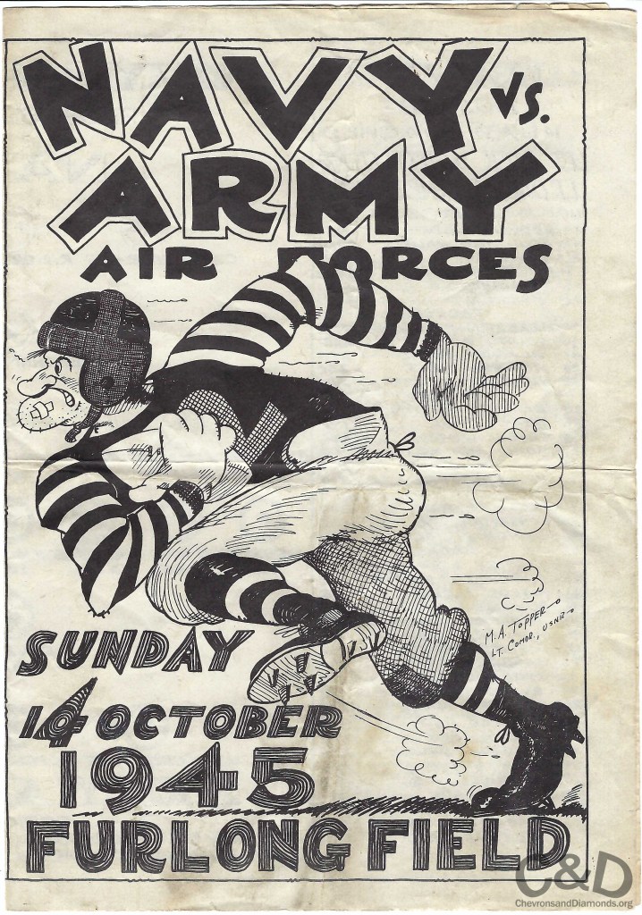 If the whimsical cover of the October 14, 1945 Navy versus Army Air Forces football game program looks familiar, that is because the artwork was illustrated by Lieutenant Commander Martin A. Topper who was responsible for a similar design for the 1945 Navy World Series scorecard. Also similar to the Navy World Series, this football game featured some of the top professional, collegiate and amateur talent who were serving in the corresponding armed forces branches in the Hawaiian Islands. Pro Football Hall of Fame enshrinees William “Bullet Bill” Dudley and George McAfee along with a few college football hall fame members are featured on the rosters.