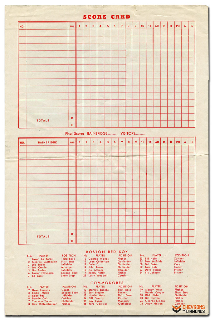 This scorecard is a single sheet, printed in monochrome ink (black on the covers and red for the internals) with a bi-fold. The inside pages feature the scoring grids, team rosters with numbers as well the season’s synopsis with schedule and results. The front cover is adorned with photos of both teams with each player identified. The back cover is adorned with images of Bainbridge leadership and a breakdown of individual player statistics.