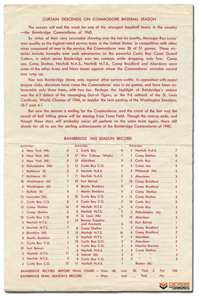 Scheduled for 4pm on Thursday, September 27, we were unable to unearth newspaper coverage of the game’s outcome. Perhaps that was the result of an unscheduled exhibition between the Washington Nationals and the Red Sox that occurred not only on the same day, but also at Bainbridge Naval Training Station’s Tome Field.