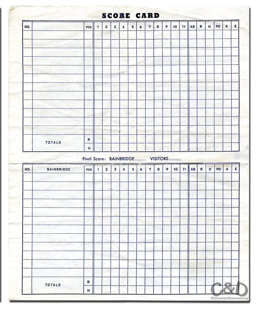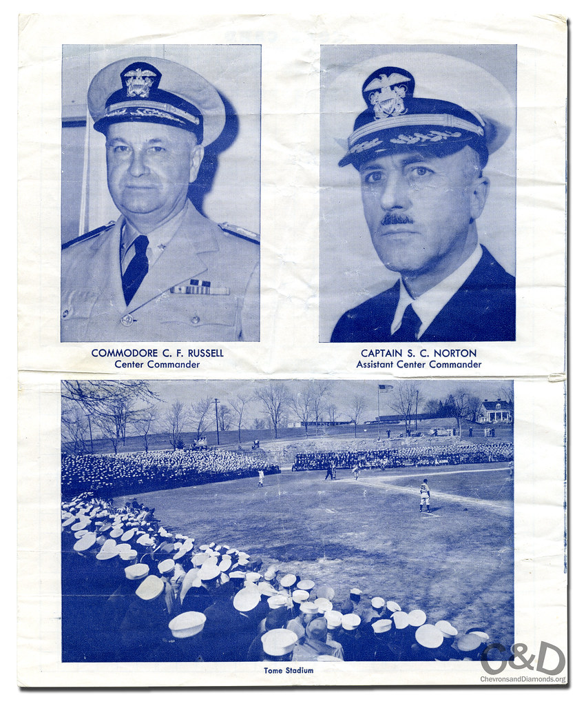 Lacking in a date for the game, this scorecard is has proven to be a challenge to pinpoint to a specific game. Due to their proximity, the Norfolk Naval Training Station and Bainbridge Naval Training Center baseball teams faced each other multiple times during the 1945 season. However, the cover images and the associated caption seem to indicate that this piece was produced and used not too long after the season commenced. In searching for game recaps and box scores, the May 19-20 weekend series may be the best guess to narrow this scorecard to.