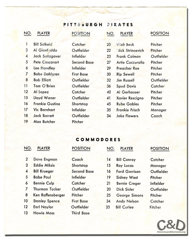 During the dog days of summer, the Pirates, following a four-game home stand with the St. Louis Cardinals, the Pittsburgh Pirates made stop in Maryland to play an exhibition game against the Bainbridge Naval Training Center’s “Commodores” before continuing on to Philadelphia to face the Phillies.