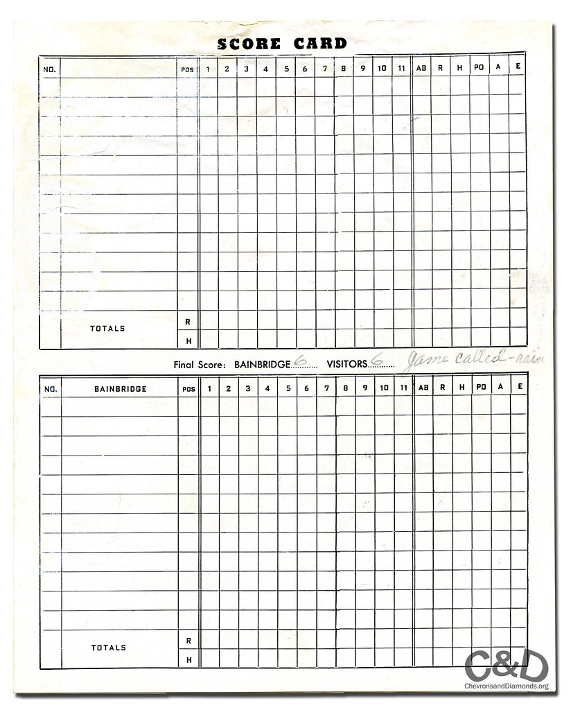 Rescigino hurled for all eight frames with Bill Salkeld calling pitches. Following West to the hill for Bainbridge was Ken Raffensberger with Benny Culp and Bill Conroy behind the dish.