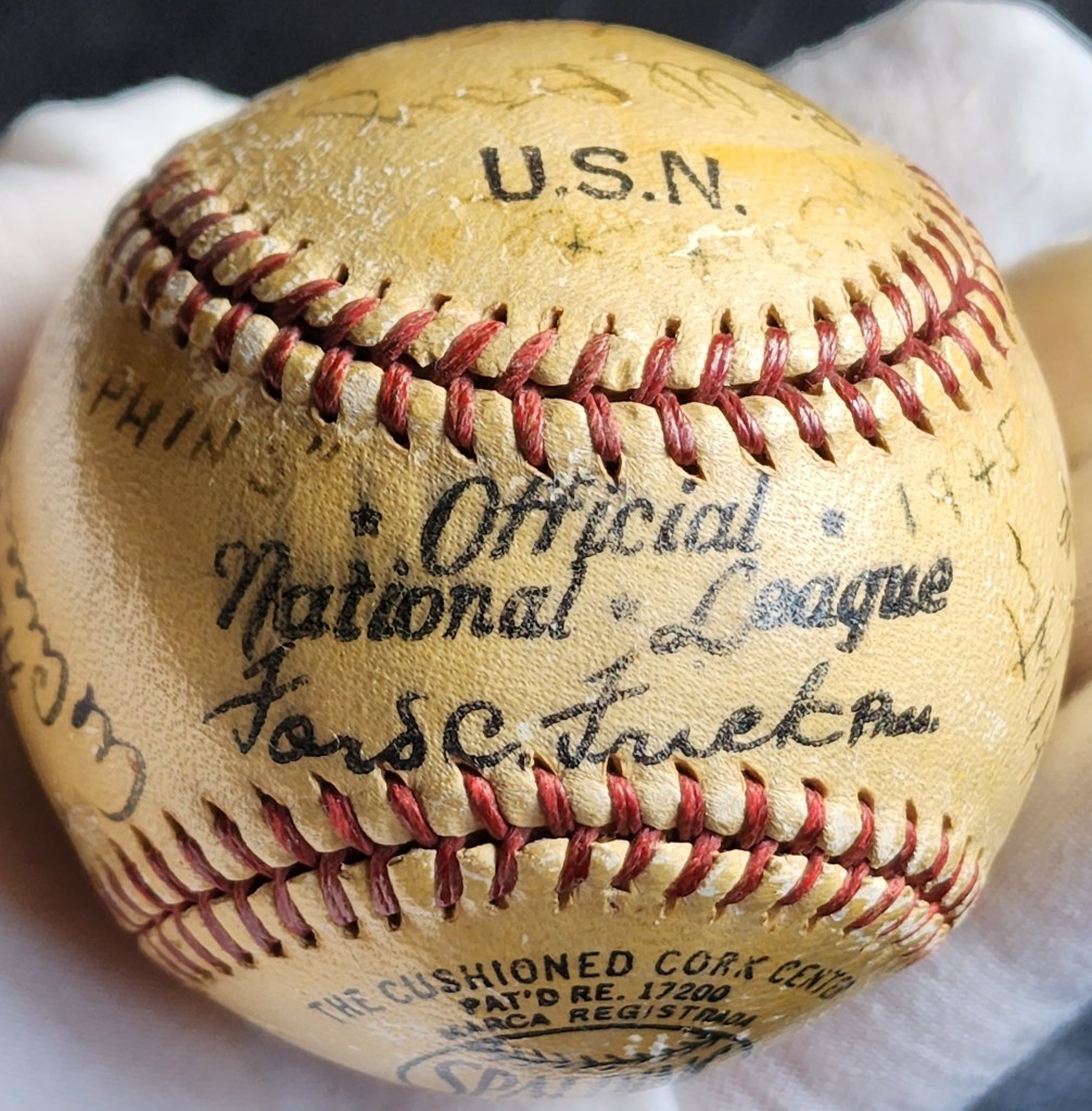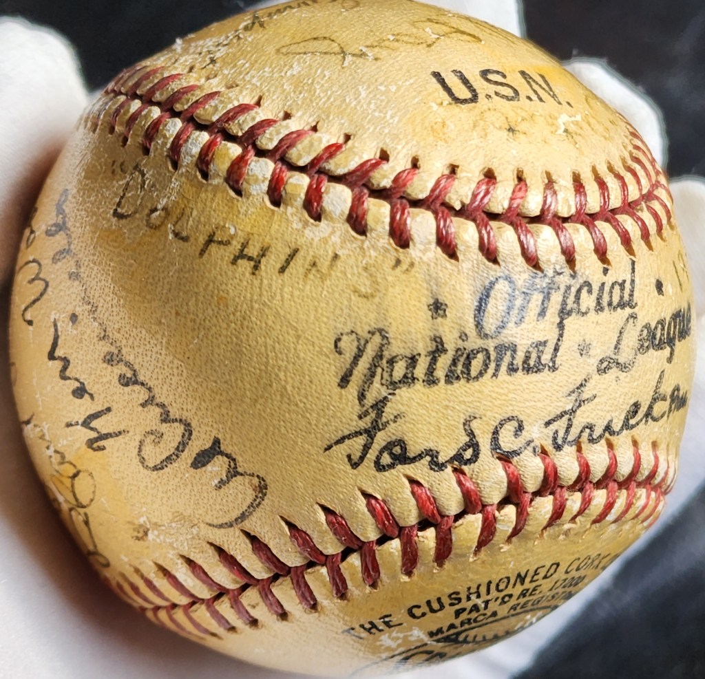 The Official National League (ONL) stamp was used from 1944 to 1946. Flanking the ONLY stamp, the ball was inscribed with “Dolphins” and “1945” which solidified the team’s identity.