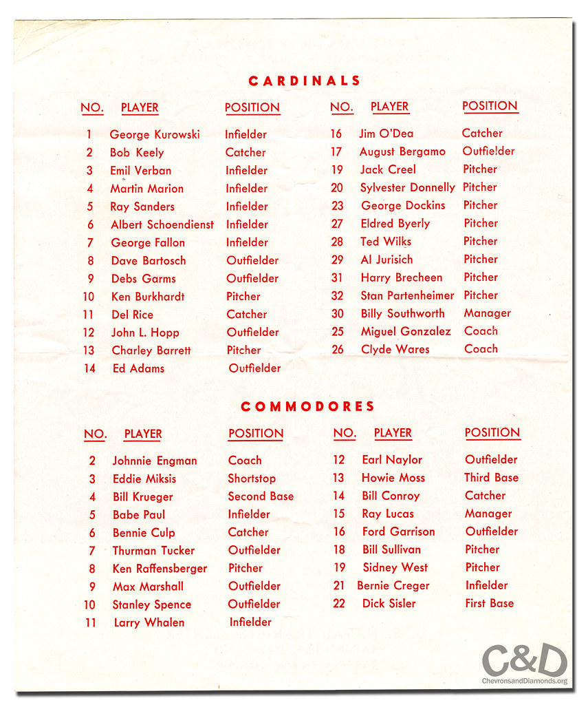 Raffensberger went the distance while Cards manager Billy Southworth sent Eldred “Bud” Byerly and Al Jurisch to the hill following Creel who surrendered 11 of Bainbridge’s 16 hits.