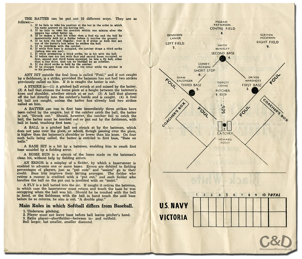 The two-color cover encloses three pages of monochrome black printing including rosters, game rules and a diagram of the baseball diamond.