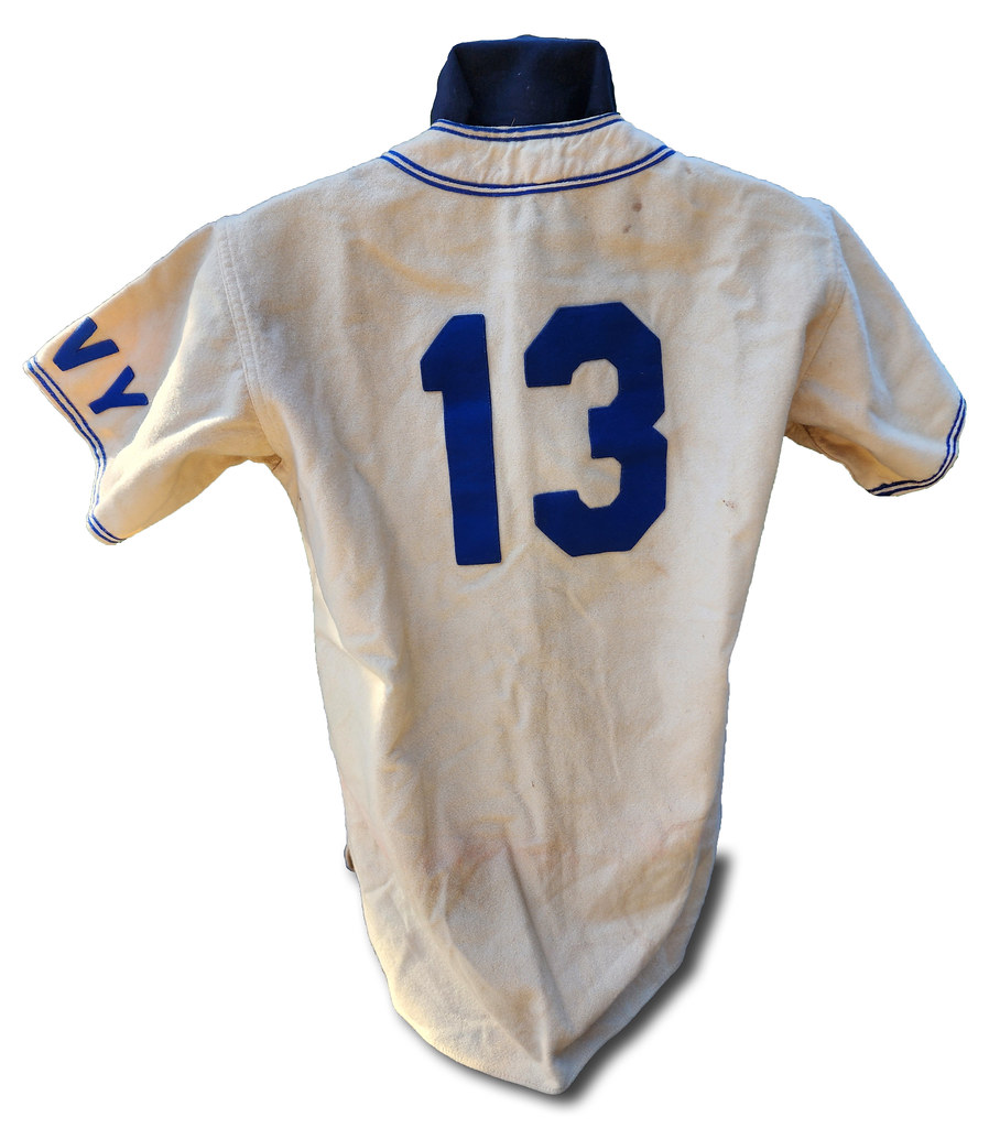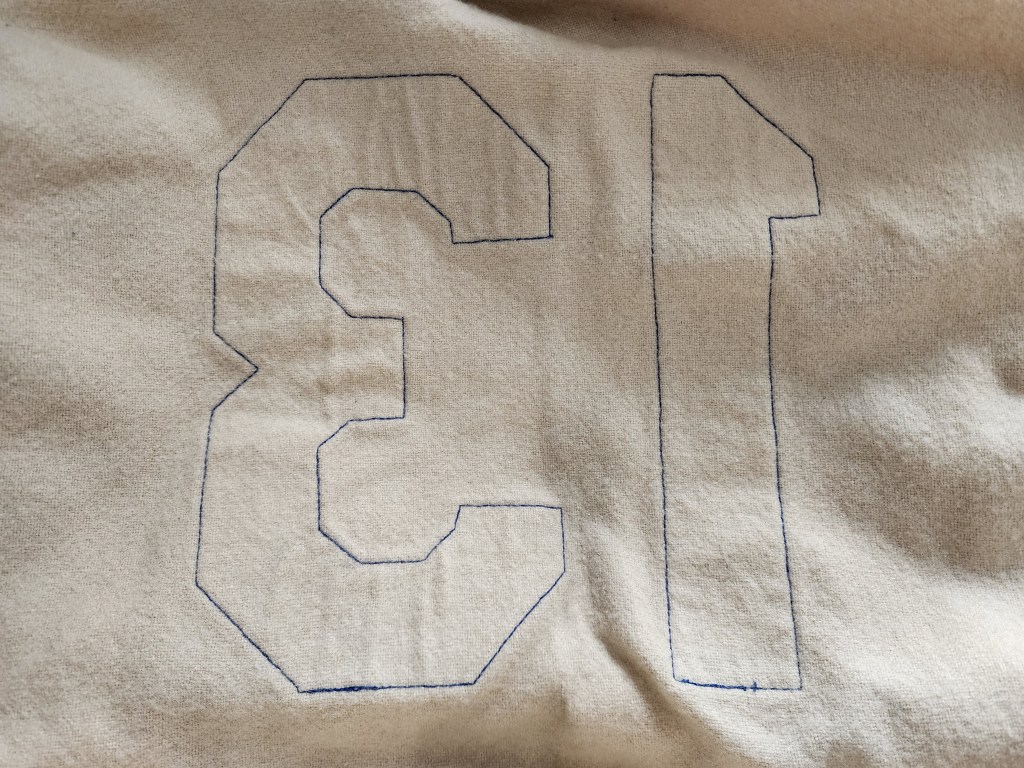 - Numerals: Seven-and-a-half inch royal blue athletic felt letters (“13”) are affixed to the back.