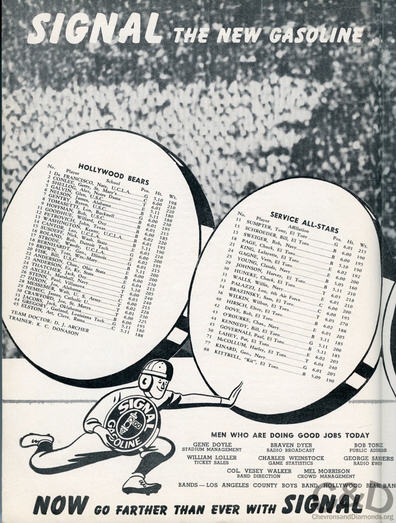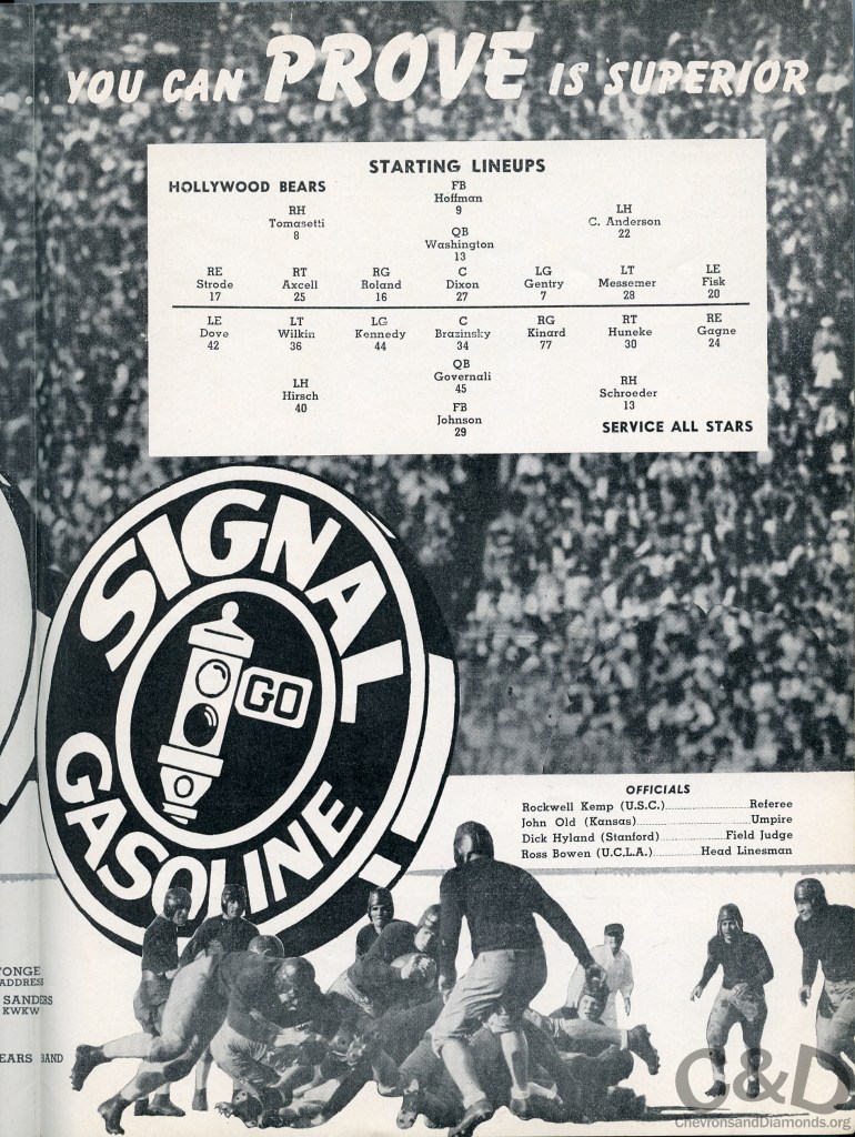 The All-Stars consisted largely of Marine Corps players augmented with five from the Navy and Lou Palazzi from the Army Air Forces. Coincidentally, all but eight of the Bears roster served during the war. Washington, like his UCLA teammate Jackie Robinson did with Major League Baseball, signed with the newly arrived (from Cleveland) National Football League’s Rams becoming the first black player in the league. Woody Strode followed Washington to the Rams before embarking on a career in wrestling and in television and film.