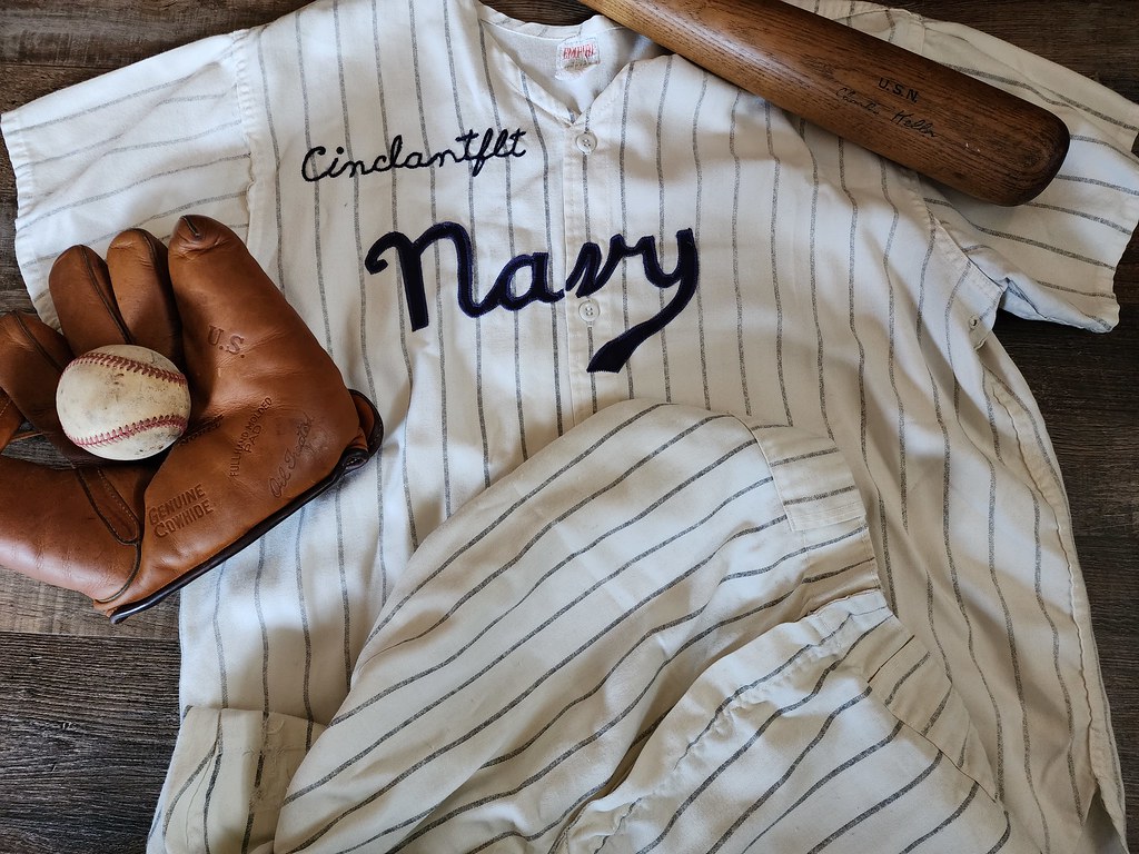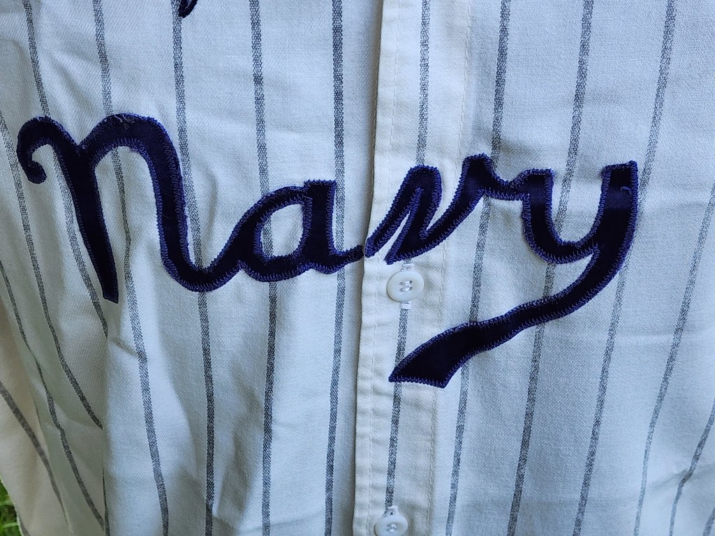This Navy flannel set was made in the 1950s by New York-based Empire Sporting Goods. The “CINCLANTFLT” chain stitch embroidery indicates the team that wore this was either the fleet champions or an all-star aggregation of star players drawn from the fleet and shore commands subordinate to the commander-in-chief of the Atlantic Fleet.