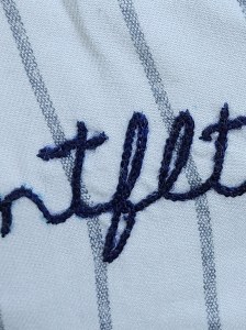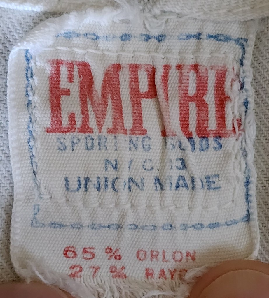 The uniform’s base material is a stark departure from our predominantly wool flannel collection. The manufacturer’s tag describes the fabric as a blend of Orlon (65%) and Rayon (27%), the remaining 8-percent is likely cotton though the frayed tag made it impossible for a definitive determination. Discontinued in 1990 after more than 50 years in use, the Du Pont-made fabric was chemically known as polyacrylonitryl and was problematic due to its low melt-point. Celebrating the material’s demise, Tony Kornheiser wrote (So Long, Orlon, Washington Post, June 13, 1990), “As a fiber, Orlon was somewhere between Qiana and Doubleknit, in the same way that Iowa is somewhere between Pennsylvania and Colorado (Qiana being the scariest of the miracle fabrics, it’s so clingy it’s almost alive). Orlon was slippery, although not as slippery as Teflon.”