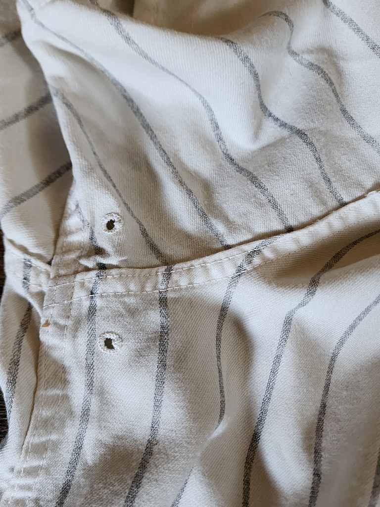 - Material: The base material is white flannel with pinstripes. The synthetic material is a blend of Orlon and Rayon.