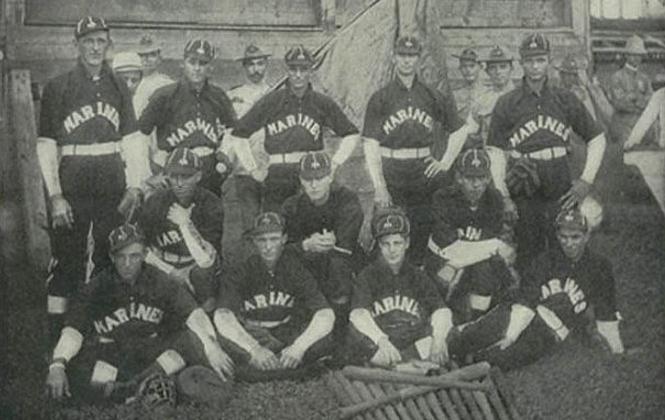 These Marines stationed in the Philippine Islands around the turn of the 20th century, pose for a photo in their baseball uniforms. The design of these flannels are somewhat plain and on par with the WWII versions.