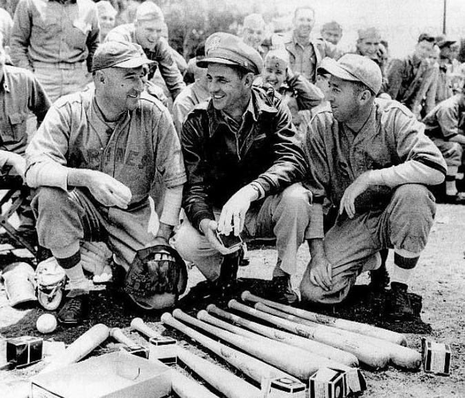 Big Leaguers Jim Bivin (left) and Cal Dorsett (right), playing for the 2nd Marine Division team in the Pacific in 1945, are visited by former Braves outfielder-turned USAAF 1st Lt. Tom Winsett at center (source: baseballinwartime.com).
