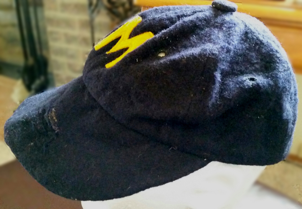There are several photographs of the “Marines” uniform being worn by men various settings. It is very difficult to discern which darker shade of gray is red or blue (considering the blue of my latest Marines uniform) is essentially indistinguishable, due to all of the WWII images being black-and-white. However, I can tell that the road gray Marines jersey is the most prevalent in photographs. There are at least two photos that could show Marines wearing the home white/blue uniform but it is impossible to confirm. There are a few different caps being worn – the most common appearing to be a road gray with a darker “M” and matching bill color (assumed to be red). What is consistent across the photos is that the font of the “M” matches the same lettering on the jerseys. The auction cap, navy blue wool, has the same font lettering “M” as is seen on all three of my jerseys. My thought is that the color yellow was used as it contrasts the navy blue and is also a prevalent USMC color used in insignia and emblems. This cap very well could be what was worn with my home white/blue uniform but sadly, I have no definitive proof and no provenance. With the matching letter and matching navy blue, I pulled the trigger and added it to my collection.