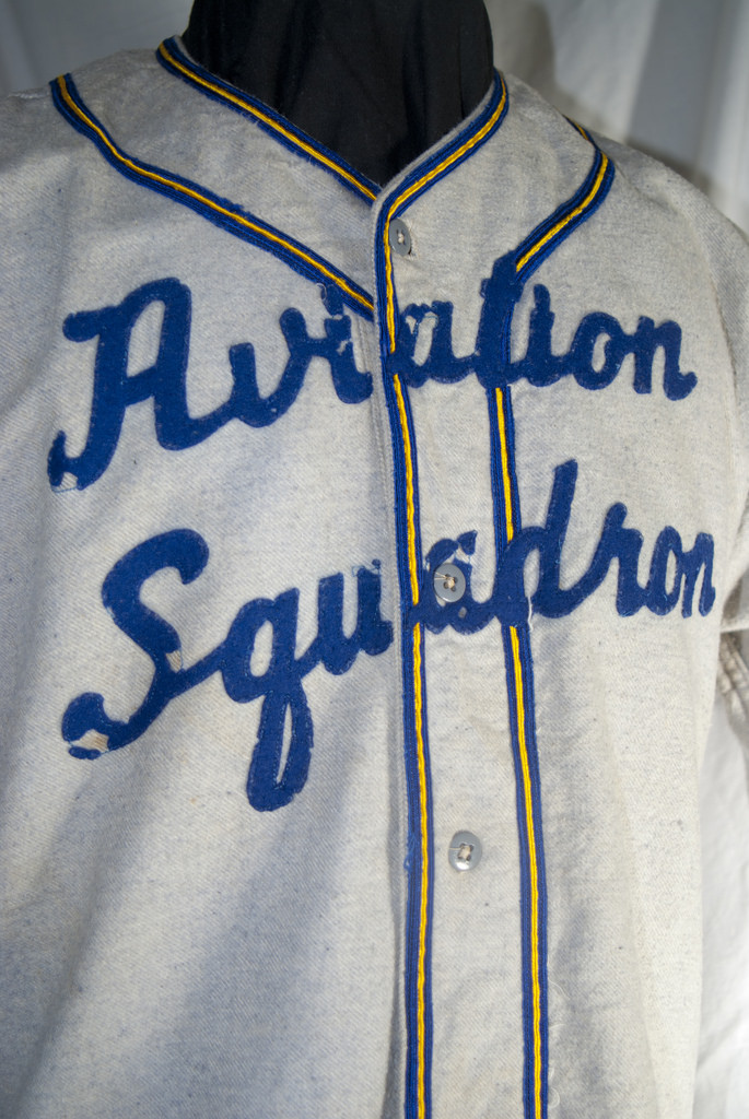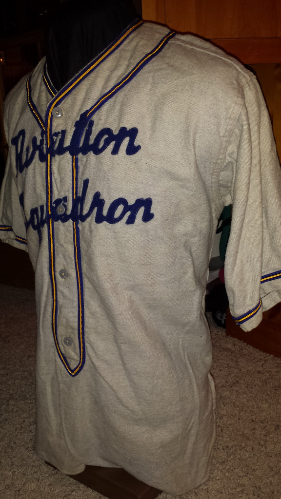 I have a soft spot for vintage jerseys and I am constantly on the prowl for anything that would help to make my collection more diverse with uniform pieces from all service teams such as Navy and Army Air Forces teams. In my collection, I now have three different World War II jerseys (two of which include the trousers) from Marine Corps ball teams. This past summer, I was able to locate ball caps that seem to accompany two of those Marines jerseys. In addition to the USMC items, I have two uniforms (jerseys and trousers) from WWII Army teams: one from the 399th Infantry Regiment and the other, a colorful, tropical-weight red-on-blue (cotton duck) uniform from the Fifth Army headquarters ball team (which reminds me that I still need to write an article about this uniform group). Two years ago, I was able to find another uniform set (jersey and trousers) that I am almost certain was from a Navy ball team, due to the blue and gold colors of the soutache and that the plackard reads in flannel script, “Aviation Squadron” adorning the jersey.