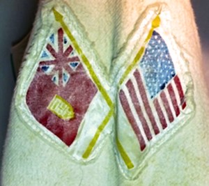 While looking through my photo archives for images of artifacts in support of another article that I was writing, I discovered images of a Navy baseball jersey that had been for sale at some point by a small, regional business that specializes in vintage sports equipment. I saved the image of the jersey for future reference due to the unique patch on the left sleeve. The patch bears two crossed flags – one is the U.S. flag and the other, a red flag with the British Union Jack in the left corner and an indistinguishable symbol in the red field. The jersey has a singular blue soutache trim and possesses the same block-lettering (as seen on the Cloudbusters jerseys – which have no sleeve patches). In searching through extensive volumes of historical Navy baseball photographs, no image has surfaced showing this uniform in use, keeping it a mystery for the time-being.