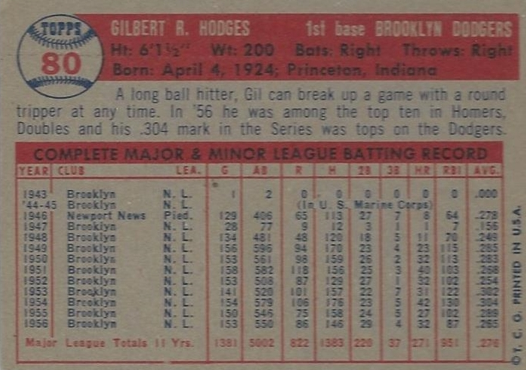 Gill Hodges 1957 Topps #80 Back