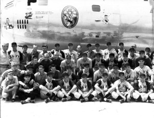 In this undated photo, the U.S. Navy team poses with airmen in front of the Superfortress known as “Flag Ship” (serial number BA 42-63504). Among the players in the image are Pee Wee Reese, Fred Hutchinson and Johnny Mize. Flag Ship would be damaged on July 24, 1944 by a crashing “Thunderin’ Loretta”(serial number 42-24913)…