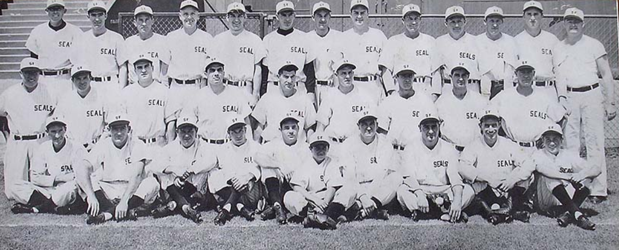 When WWII ended and the players returned from serving, the Seals roster was full of veterans (in capitals): Bottom row: EDDIE STUTZ, Neill Sheridan, Bruce Ogrodowski, DON TROWER, FERRIS FAIN, Morris (batboy), Hal Luby, Frank Rosso, Vince DiMaggio, Matzen (ball boy). 2nd Row: Lefty O’Doul (manager), Frenchy Uhalt, DON WHITE, SAL TAORMINA, TED JENNINGS, Roy…