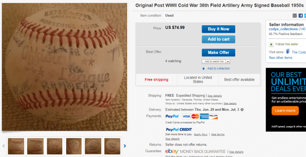 With nearly a decade of collecting military baseball artifacts, I was never successful in locating any baseballs that were connected to the game. I have written a few times (see here and here) regarding the fakery and outright fraud that is being foisted upon potential military baseball collectors and one seller in particular has been quite successful and absolutely unchecked as he has racked up several thousands of dollars as he cheats people who have no understanding of the balls that were actually used by military service teams. There has been a smattering of authentic military baseballs, but I have always missed out when presented with the opportunities.