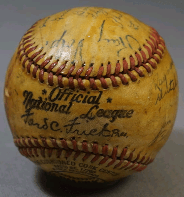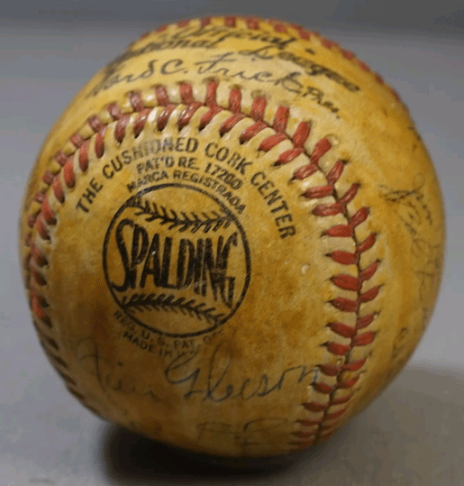 Several weeks ago, I was able to acquire my second military baseball (my first, a 1956-dated, team-signed ball from the 36th Field Artillery Group) after it was listed in conjunction with among a spate of items (originating from the same collection) that were all related to military baseball teams the Central Pacific area, in and around the Hawaiian Islands during World War II. Judging by the number of bids and potential buyers who were watching the three other auctions compared to a few who were watching (and had submitted bids on) what was listed as an autographed Navy-team baseball from the 1940s. The ball (aside from the signatures) is a easily datable, official National League (“Ford C. Frick”) Spalding baseball from 1943. With a glance at the auction listing’s photos, (aside from the obvious coating of shellac covering the ball) I recognized a few names on the ball though several were hard to discern.I decided since the bid amount was so low that it was worth risking (based solely on the verifiable age of the ball). With only a few hours remaining, I set my bid amount and waited.