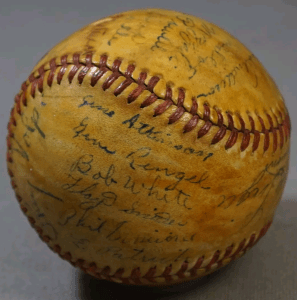 I was elated to have a chance at this ball even though it was lacking signatures from the stars of the major leagues such as Pee Wee Reese, the DiMaggio brothers, Vander Meer, Hutchinson or my favorite, Ferris Fain. I wasn’t able to positively identify all of the signatures and two of them are almost completely faded or entirely illegible. There are a few major league ball players and several minor leaguers that have been identified. Those with an asterisk (*) were located on the Navy versus Major League All-Stars: Weaver Field, Submarine Base, April 19, 1944 score book (the double asterisk indicates a possible correlation between the signature and a name listed on the score book).