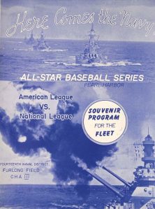 Ted Williams, after serving as a flight instructor for nearly a year in Florida, was in transit to Hawaii as the atom bombs fell on Hiroshima and Nagasaki prompting the Japanese to accept an unconditional surrender. Upon his arrival at Pearl Harbor, the Splendid Splinter was added to the all-star Navy roster of major leaguers to play in the September-October, seven-game Navy World Series (not to be confused with the 1943 series played at Naval Station Norfolk’s McClure Field). Navy players, originating from National League teams before WWII, defeated their American League counterparts, four games to two despite the AL’s composite tally outscoring the NL, 30-24 total runs (the AL, led in part with a home run by Pesky, took the fourth game by a 12-1 margin). Though he was on the roster, Williams was a non-factor, perhaps distracted by thoughts of shedding his Marine Corps uniform, not having been sent to fight after more than three years of service. Though the rosters were stocked with major league ball players there were only a handful of stars from the big leagues. Culled together from multiple sources (in the absence viewing the program shown above) are the rosters of Navy ballplayers from each of the major leagues (the asterisk denotes election to the Hall of Fame). There is name on the American League roster who I was not able to narrow down (there were multiple players named Harris).