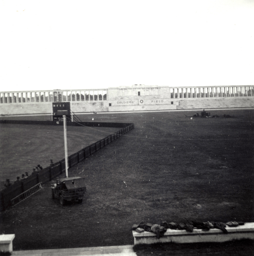 Contained within this group is a veritable walking tour of the newly-named, Soldier’s Field with the Third Army insignia placed not too far from where the emblem of hate was once displayed. Stadium seating, rather than having chairs as within American ballparks, were steps covered with grass to provide natural, comfortable (with the exception of during inclement weather) places to sit and watch the games. An outfield fence with foul poles and a center-field scoreboard situated 400 feet from home plate