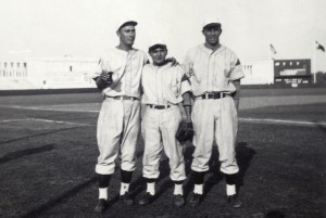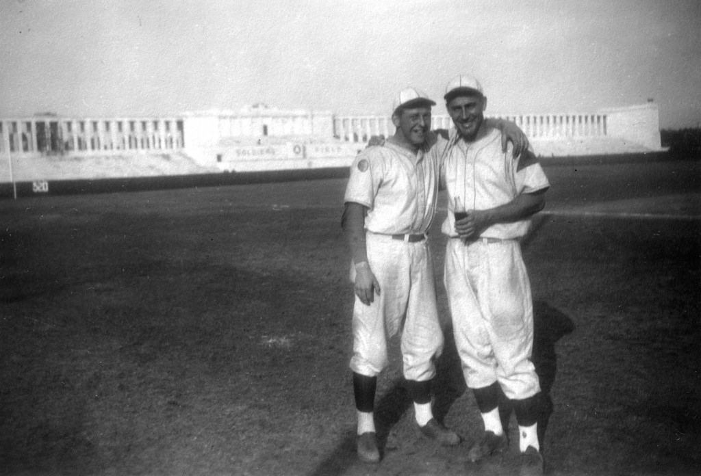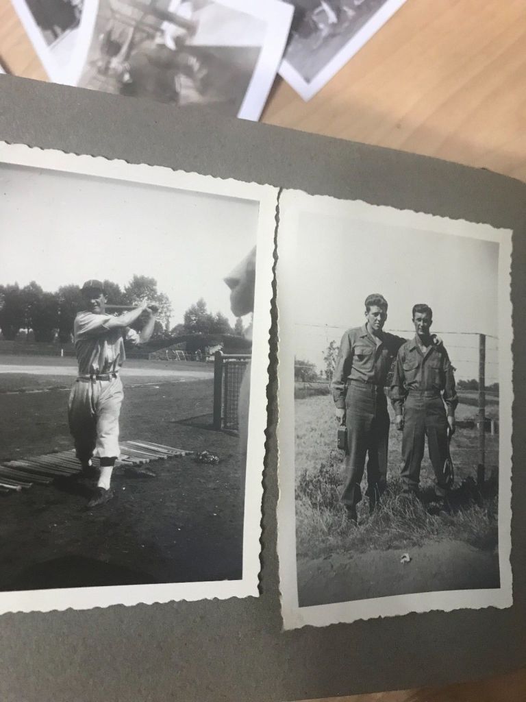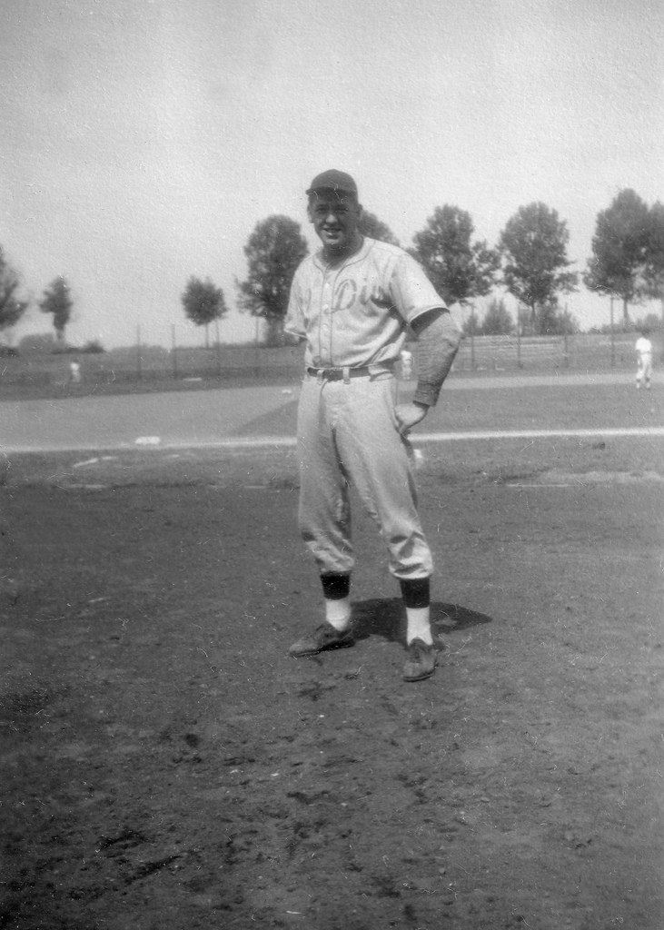 Two faces that I have positively identified are Don Kolloway and Erwin Prasse (the latter was unconfirmed on the roster until he was positively IDd in Ghelf’s photographs). Kolloway had a 15 year professional baseball career (12 in the major leagues) while giving part of his 1943 year and two additional seasons to his service in the army and was awarded the Bronze Star after seeing combat with the 29th ID. Erwin Prasse was an all-around athlete who was drafted by the Detroit Lions (following his University of Iowa career where he earned nine letters in three sports) and, instead pursued professional baseball and basketball (playing for the NBL Oshkosh All-stars) careers. According to his obituary, Prasse landed on Omaha Beach on D-Day (the 29th ID supported the 116th Infantry) and was later shot in the arm while on reconnaissance in Germany. Following his time in occupied Germany competing on the diamond and the hardwood, Captain Erin Prasse was discharged from the Army in 1946,