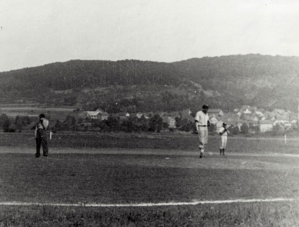 A few months ago, I spotted an auction listing that was a group containing military sports-related artifacts consisting of photos (both in an album and loose), ephemera and a medal from the ETO in 1945-46. The listing’s images showed glimpses of the photos and spotlighted the (named) engraved medal. Since the auction was hours away from closing when I discovered the listing, I set my bid and planned on researching the group when (if) I won it. A few days after auction close, the package arrived. While the bulk of the photos were merely snapshots, they provided a visual narrative of the veteran’s experiences in the months following the German-surrender as a part of the occupation forces. Images can be seen of baseball players in their flannels (in team poses, warming up or just preparing for games) and the same faces in their Army uniforms in the surrounding areas. Also seen are photos of heavily damaged buildings (from aerial bombardment), artillery emplacements and the Zeppelinfeld (often referred to as Nürnberg Stadium (note: that Nürnberg and Nuremberg are synonymous and interchangeable. The origins of one spelling and pronunciation over the other is unknown and can be the subject of debate), but better known by American forces as Soldiers’ Field) converted for use as a baseball stadium.