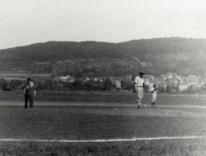 The handwritten notation on this photo describes Earl Ghelf (on the pitcher’s mound) as having “atom bomb power with pinpoint accuracy.”