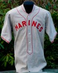In the years since bringing home that first road gray Marines uniform, I acquired two other WWII Marines jerseys which, for a Navy veteran is a bit humorous given the friendly rivalry between members and veterans of each branch. The most common of the three, the road gray flannel (trimmed in red) is often seen listed at auction at least a half-dozen times each year. The second of my Marines acquisitions, a red cotton (trimmed in gold) was one of three that I have seen in nearly a decade of collecting these scarce WWII military baseball uniforms. The third, the home white flannel (trimmed in blue) was located in the spring of 2017 and is the only one I have ever seen. The caps (seen above with both the white and red uniforms) were located in the summer of 2017, several weeks apart and none have been seen since.