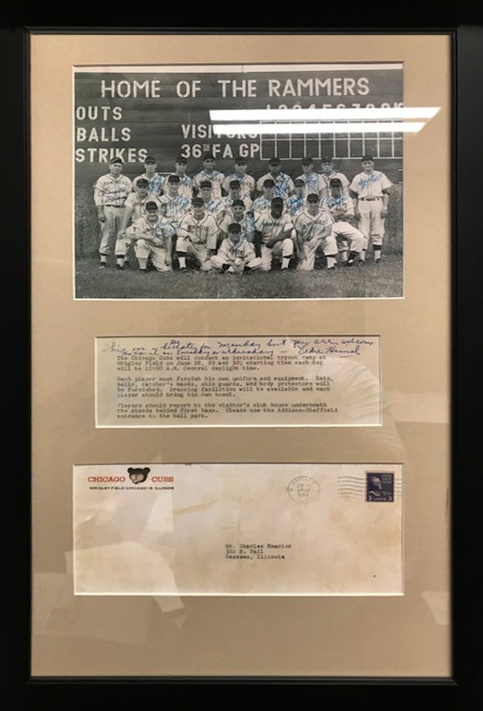 When Chuck Emerick’s grandson sent me the team photo of the Rammers, he also included views of the document and envelope that was framed with the image. Mr. Birmingham mentioned that while Chuck was still in high school, his baseball talents were observed by professionals. “In 1954 the Chicago Cubs saw him play in high school and asked him to go to Wrigley Field for tryout camp.” Birmingham continued, “He was only 17 or 18 when he tried out. He traveled to Chicago by himself and tried out the summer of 1954.” Mr. Emerick’s workout at Wrigley must have had mixed reception with team management as his skills were good enough to warrant an offer to sign but showed indications of lingering pain. Joshua, speaking about his grandfather’s potential pro baseball career wrote, “Unfortunately, he suffered a shoulder injury in football so they were hesitant on signing him.” Being a diehard fan of Chicago’s National League team, Emerick’s dream of playing Cubs was laser-focused on that one club. Mr. Birmingham spoke of his grandfather’s sole desire play at Wrigley, “They (the Cubs organization) asked him to play for one of their farm league teams to see how his shoulder would hold up, but he didn’t want to do that.”